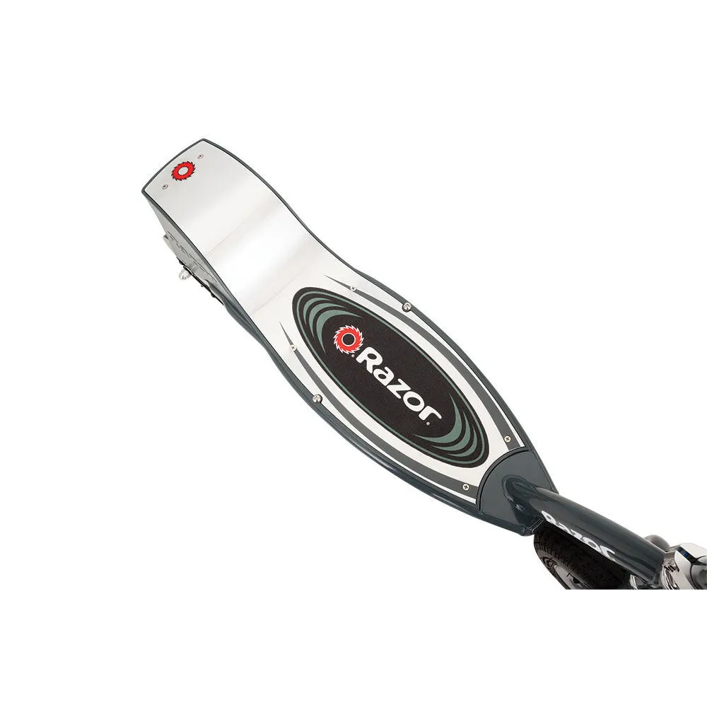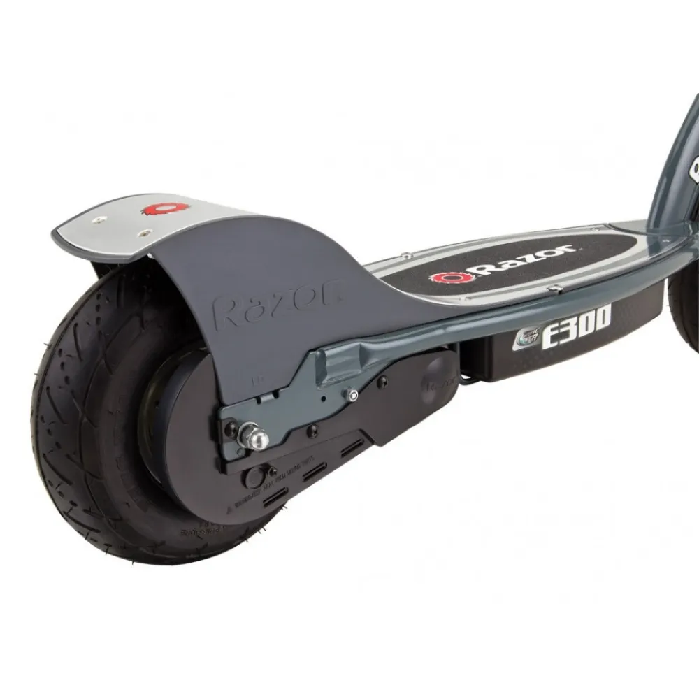 Razor E300 развивает скорость около 24 км/ч, благодаря мотор-колесу мощностью 250 Вт. Агрегат имеет задний привод. Аккумулятор емкостью 7 А*ч обеспечивает питание двигателю. На одном заряде батареи можно проехать 20 км пути. Для безопасного управления имеется задний ручной тормоз.